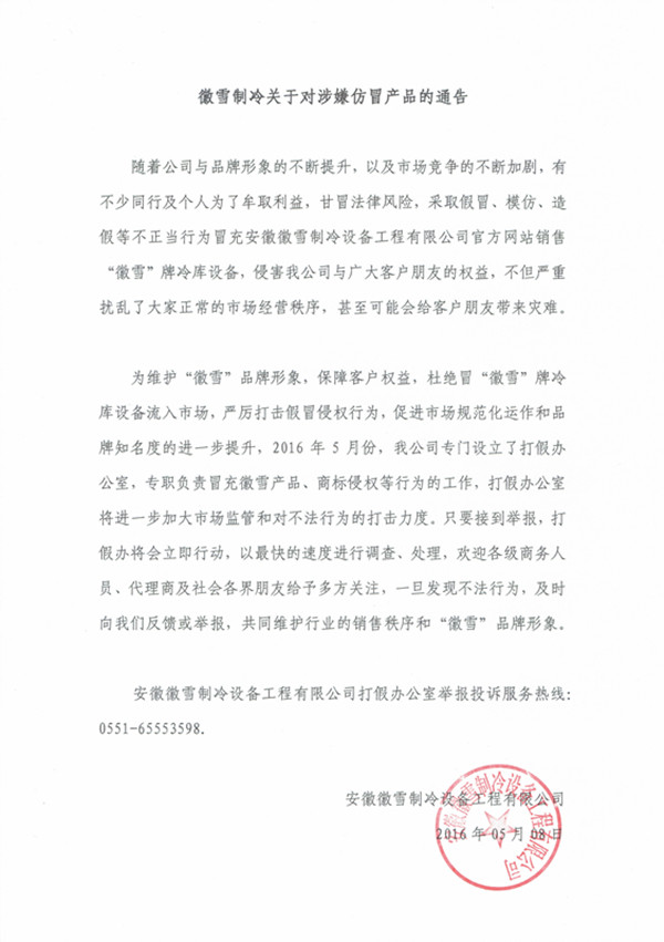 為維護(hù)“徽雪”品形象,保障客戶權(quán)益,杜絕冒“徽雪”冷庫設(shè)備流入市場,嚴(yán)厲打擊假冒侵權(quán)行為,促進(jìn)市場規(guī)范化運(yùn)作和品知名度的進(jìn)步提升,2016年5月份,我公司門設(shè)立了打假辦公室,職負(fù)責(zé)冒充徽雪產(chǎn)品、商標(biāo)侵權(quán)等行為的工作,打假辦公室將進(jìn)步加大市場監(jiān)管和對(duì)不法行為的打擊力度。只要接到舉報(bào),打假辦將會(huì)立即行動(dòng),以快的速度進(jìn)行調(diào)查、處理,歡迎各商務(wù)人員、代理商及社會(huì)各界朋友給予多方關(guān)注,旦發(fā)現(xiàn)不法行為,及時(shí)向我們反饋或舉報(bào),共同維護(hù)行業(yè)的銷售秩序和“徽雪”品形象。